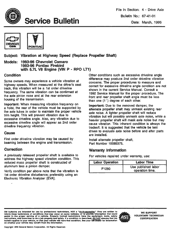 This problem is an unbalanced driveshaft. Most people with the problem feel it at its worst between speeds of 90 and 120 MPH. Others claim they can also feel it by slowly bringing the RPMs up to the 1800-2000 range with the car in park or neutral. But that isn't necessarily the same problem. Some even start to feel it as low as 60 MPH. It usually starts with a mild resonating vibration you can feel through the gas pedal. Then in at 80 - 90 MPH, the vibration intensified and feels as though it's coming from the center of the car.It seems cars are coming off the assembly line with the unbalanced drive shafts. A Technical Service Bulletin (#674101) addresses this calling for replacing the stock driveshaft with a 3rd generation all-aluminum driveshaft (part #10085375) which came with the 1LE equipped cars. Although there have also been instances prior to the TSB where it was replaced with the standard 3rd gen steel driveshaft (part #26004464). Either seems to work just fine (although the aluminum one is lighter in weight). Make sure you let your dealer know what the TSB number is as it will be fixed under warranty.